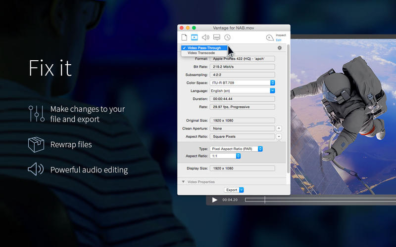 Play, QC, fix and deliver. Designed for broadcast & media QC professionals. Adds more playback support, loudness monitoring, advanced metadata display, compare media feature, preview to an external monitor, and iTunes package export.