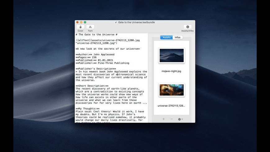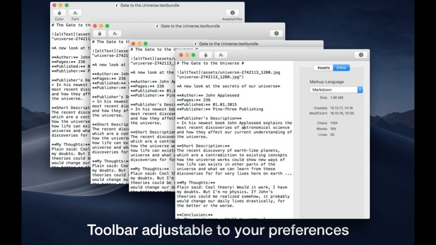 ApplicationsEditorTextbundle Textbundle Editor 1.0.0 by mac torrent June 14, 2020 June 14, 2020 ( Textbundle Editor 1.0.0 )Loading... Download With Textbundle Editor you can quickly and easily open, edit and create new Textbundle- and Textpack-files. Customize your Editor It is completely up to you what the text editor should look like. Textbundle Editor allows you to freely set the font, font size, font color, and background color of the text-editor as you like best. Assets The special feature of Textbundle- and Textpack-files, the inclusion of “assets”, files of any kind, is natively supported by Textbundle Editor. So you can easily and conveniently add assets to your Textbundle- and Textpack-files and also remove assets from files. Integrated Info For each file, you can display an info overview with the most important details for each file. In addition to the creation date and modified date, you can also overview the size of the file and counters for the number of characters, words and lines of the current file. Markup-language A Textbundle-file usually provides a Markup-language defined within the Textbundle-file. In the info overview of the current file you have the option to set your file to one of the following markup languages: Markdown, MarkdownExtra, MultiMarkdown, Textile, Wikitext, HTML, BBCode, Smark Dark mode Textbundle Editor offers a dark mode, which can be activated individually at any time in the program itself. This provides dark mode for Textbundle Editor in all macOS versions supported by Textbundle Editor. Customizable Toolbar You can also customize the look of the toolbar to suit your own preferences. General macOS Functions Of course, Textbundle Editor provides all the other functions expected of a macOS program, such as Full Screen Mode, Spell Checker, Merge All Windows and so on. Compatibility: OS X 10.10 or later 64-bitHomepage https://xelaton.com Screenshots Name: Textbundle_Editor_1.0.0__TNT_Mactorrents.io.dmg Size: 5 MB Files Textbundle_Editor_1.0.0__TNT_Mactorrents.io.dmg[5 MB] Download Related Posts:JU-106 Editor 2.5.2JU-106 Editor 2.5.4JU-106 Editor 2.5.3Xliff Editor 2.9.11 Download 0 comment TwitterRedditEmail mac torrent MacTorrent - Torrents in Mac. Free Apps, Games & Plugins. Apple Final Cut Pro & Logic Pro X, Adobe Photoshop, Microsoft Office, Pixel Film Studios, previous post Easy Data Transform 1.5.0 next post Drama 2.1.0
