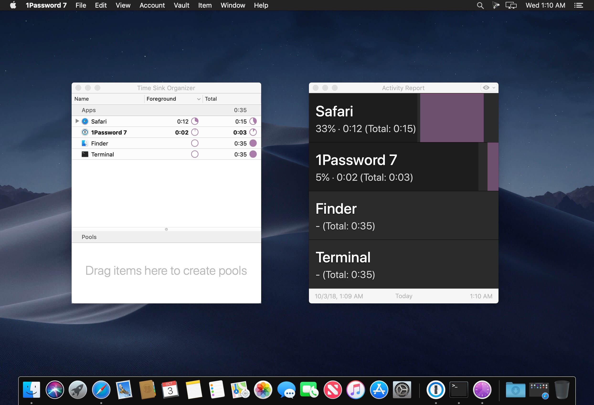To help you track related activities, Time Sink uses Pools, which are simply collections of related windows. Creating a Pool is as simple as dragging and dropping a window (or app) from the Apps section styleof the Time Sink window to the Pools section.