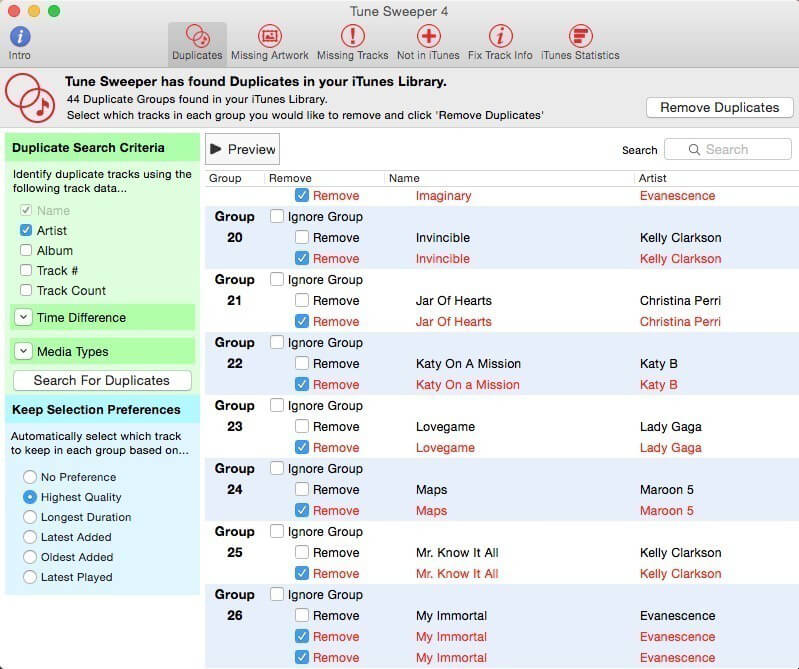 Tune Sweeper is a powerful tool for cleaning your iTunes library. It makes finding and removing duplicate tracks from your iTunes library a breeze. Tune Sweeper can also be used to download missing track information and artwork to your tracks.