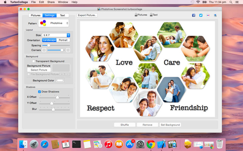 TurboCollage (was Collage Creator) gives you the power to create stunning picture collages. Setup a collage with a prominent center picture, arrange pictures in a regular grid, or create a random picture pile. Tie fond memories together into gorgeous picture mosaics. With an intuitive interface, Collage Creator gives you complete control over your collage design.