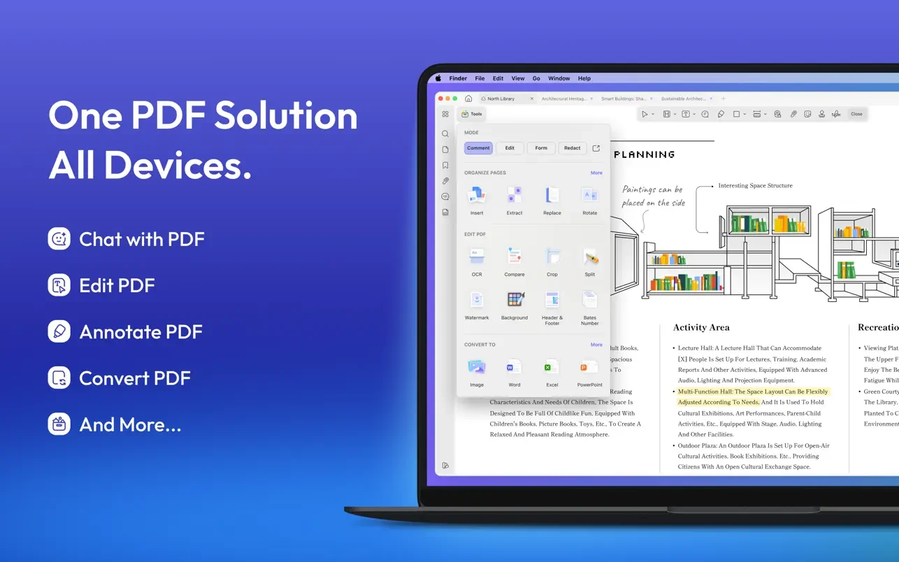 UPDF is a comprehensive AI-powered PDF editing software that can be used for AI chat with PDFs, editing, annotating, converting PDFs, and more. One UPDF license allows you to use it on all platforms, including macOS/iOS/iPadOS (universal purchase).