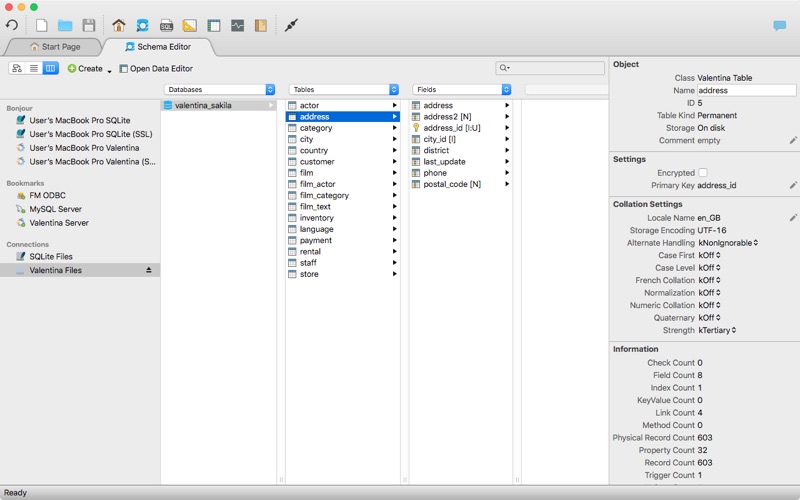 • Schema Editor (tree view and column view) – create and modify all schema objects of supported databases: Tables, Views, Fields, Enums, Links, Constraints, Triggers, Indexes, Stored Procedures, …