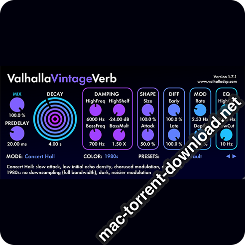 FreeMacSoundsv202ValhallaDSPValhallaDSP ValhallaVintageVerbValhallaVintageVerb ValhallaDSP ValhallaVintageVerb v2.0.2 November 9, 2019 ( ValhallaDSP ValhallaVintageVerb v2.0.2 )Loading... Download Download ValhallaDSP ValhallaVintageVerb v2.0.2 ValhallaVintageVerb is a postmodern reverb plugin, inspired by the classic hardware digital reverbs of the 1970s and 1980s. 18 Reverb Algorithms: Concert Hall. Based on the hall algorithms of the late 1970s and early 1980s. Huge spatial image, echo density that can be adjusted from very sparse to very dense, and lush chorusing modulation. Bright Hall. Similar to the Concert Hall algorithm, but with a brighter initial sound, and deeper and lusher modulation. Plate. Inspired by early 1980s plate algorithms. Highly diffuse, bright initial sound, high echo density, lush chorused modulation. Room. Emulates the sound of early 1980s room algorithms. Medium diffusion/early echo density, somewhat darker sound, chorused modulation. Chamber. A transparent and dense algorithm. Highly diffuse, high echo density, less coloration than Plate/Room algorithms, chorused modulation. Random Space. This generates DEEP and WIDE reverbs, with a slow attack, and more diffusion than the late 1980s algorithms that inspired it. The modulation uses internal delay randomization, to reduce metallic artifacts without the pitch change that can occur in the algorithms with chorused modulation. Chorus Space. Same as Random Space, but with the delay randomization replaced with lush chorused modulation. Ambience. Combines time varying randomized early reflections with a full-featured reverb tail, with the balance between early and late reverb controlled by the Attack knob. Useful for adding “air” to drums, vocals, and any place where a reverb should be felt but not heard. Sanctuary. Inspired by a classic German digital reverberator from the 1970s. Discrete early reflections, a dense late reverb that rapidly builds in echo density, lush detuned modulation. Sanctuary incorporates the bit reduction and floating-point gain control used in the A/D and D/A convertors of the early digital hardware. Dirty Hall. A fresh look at the Concert Hall algorithm, with the goal being to emulate the strange fixed point and convertor artifacts of early 80s reverb hardware. Lusher and denser than the Concert Hall algorithm, with loads of warmth and grit on tap, for a roughly hewn beauty. Plug in your analog synth and send yourself into retro sci-fi heaven. Dirty Plate. All the warm and gritty artifacts of Dirty Hall, applied to an old-school digital plate algorithm. High echo density, wide stereo image, and just the right amount of metallic sheen. Drums come alive when sent through Dirty Plate. Smooth Plate. The complete opposite of Dirty Plate. Smooth decay at all settings, from short to near-eternal. Lush chorusing, with none of the metal found in Dirty Plate. The most transparent and naturalistic reverb in ValhallaVintageVerb. Crank up the Size parameter, and float off into space! Smooth Room. A smooth and transparent room reverb, in the Smooth Plate style. Useful for emulating the Room/Hall algorithms of late 1980s hardware, as well as getting clear reverberation with low amounts of coloration. Smooth Random. A random room/hall algorithm, with transparent decays that can be adjusted from tiny to huge. Randomized delay modulation, similar to Random Space, but with a much tighter initial attack and smoother decay. A good “jack of all trades” reverb algorithm. Nonlin. Gated, reverse, and nonlinear reverbs are all on tap here. Use Size to control the duration of the reverb, and Attack to smoothly interpolate between a truncated reverb, a “flat” gated decay, and huge reverse reverbs. Lush chorusing modulation on tap, for your shoegazing needs. Chaotic Hall. A chaotic take on the Concert Hall algorithm, with modulation and saturation artifacts inspired by classic tape echoes. Lush and warm, with subtle wow and flutter chorusing that adds depth without making your reverb seasick. Chaotic Chamber. Smooth and chaotic at the same time. A relatively “dimensionless” reverb algorithm, that adds depth to your sound. Wow and flutter modulation, subtle tape saturation. Use this algorithm on pretty much any input, and it will sound good. Chaotic Neutral (new in 2.0.2). Combines chaotic modulation with a fairly “colorless” algorithm architecture, for a reverb that sounds like the input – just with reverb! 3 Color Modes For Dialing In The Tone Color And Sonic Artifacts Of A Specific Reverb Era: 1970s. Replicates the reduced bandwidth of the earliest digital reverberators (10 kHz maximum output frequency). Downsampled internally, to reproduce the artifacts of running at a lower sampling rate. The modulation is dark and noisy, and can produce strange and random sidebands with sustained notes. This is intentional. 1980s. Full bandwidth / sampling rate, for a brighter sound than the 1970s. The modulation is still dark and noisy, but will produce different artifacts than the 1970s mode as it is running at the full sampling rate. NOW. Full bandwidth / sampling rate. The modulation is clean and colorless, versus the funky artifacts of the 1970s/1980s modes. The Interface Has Been Designed To Be Instantly Accessible And User Friendly: Streamlined set of powerful parameters, organized into logical categories. All controls on one panel. No menu diving required. Tooltips at the bottom of the plugin window, that describe the currently selected reverb mode and color mode, as well as any parameters the user is adjusting. The goal is for the plugin to be self-documenting. A powerful cross-platform preset menu, with the ability to copy and paste presets in a text format. Share presets via emails, forum posts, etc. Continuously resizable – just click on the lower right corner and drag to the desired size. Modernist, minimalist 2D graphic design. New in 1.7.1: Click on the “GUI Mode” text in the upper right c