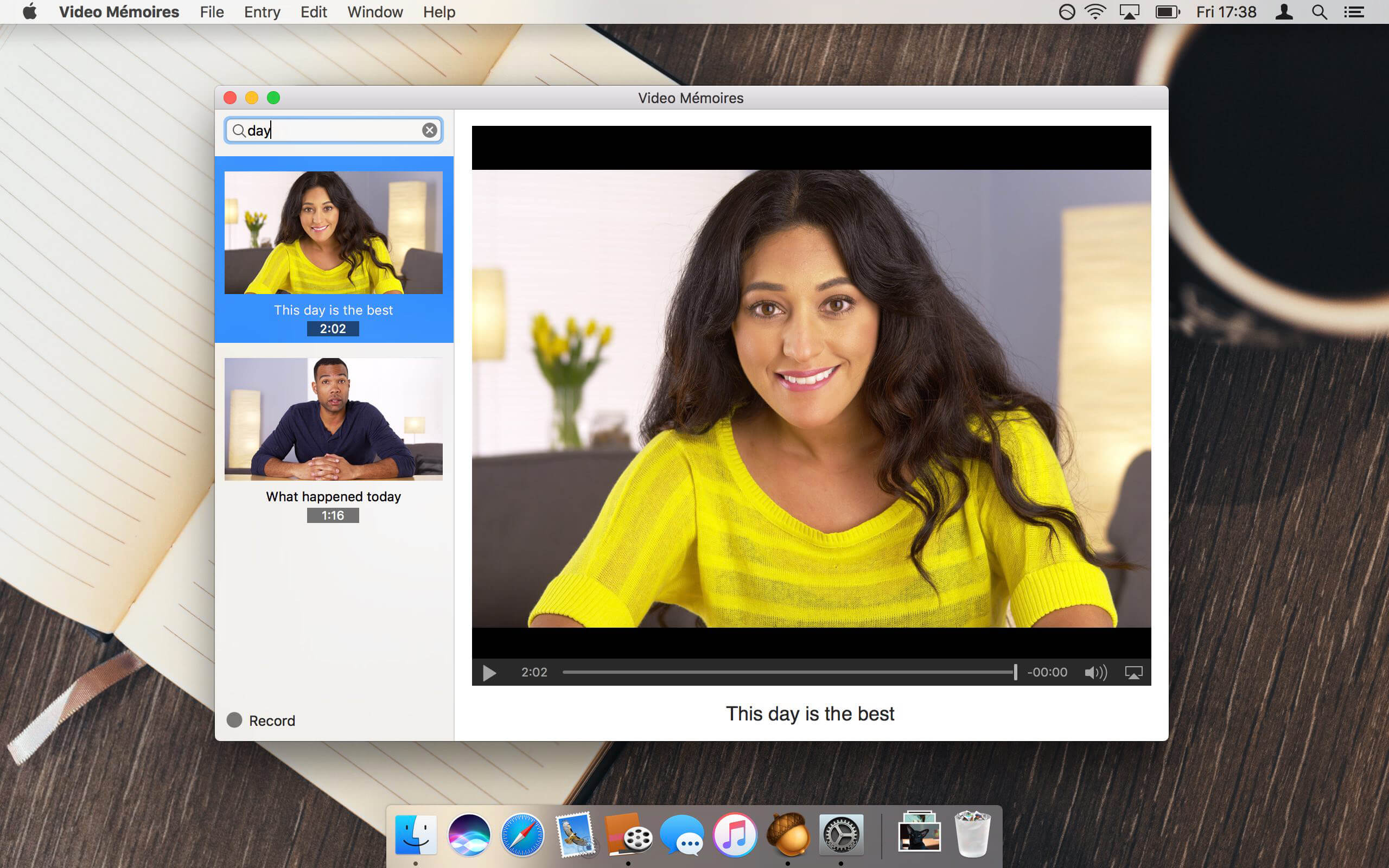 Video Mémoires is video diary software for Mac. Record your today’s diary entry in seconds by clicking on a button. Browse the calendar and watch your previous entries, or use quick search to find your past videos.
