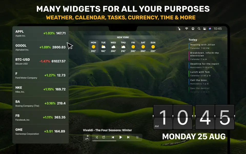 Applications Widgetter System Stats Widgets 2.3.4 by mac torrents November 15, 2025 November 15, 2025 ( Widgetter System Stats Widgets 2.3.4 )Loading... Download Widgetter is your best assistant in organizing your desktop space! Intuitive widget interaction, stylish design, and a large collection of widgets allow you to customize your workspace exactly how you like it. The app includes a collection of wallpapers and widgets, grouped into themes with multiple design variations. You can also choose and install 4K and 5K wallpapers from the library. Customize the widget size freely so it fits your layout perfectly. FULL CUSTOMIZATION: Adjust colors and fonts to match your style. Current Widgets Available in Widgetter Date and TimeA stylish clock available in several variations and design options. CalendarA visual monthly calendar always in front of you. WeatherView essential weather details for today and the upcoming week. BatteryMonitor your battery level and overall condition. PlayerSet the perfect atmosphere by choosing your favorite tracks directly from the playlist window. Internet Speed & Data UsageTrack your current internet connection speed and downloaded data. Currency & Cryptocurrency QuotesStay updated on exchange rates and stock market movements. Tasks & RemindersKeep all your tasks visible so you never miss anything important. CPU MonitoringTrack CPU load in real time for smooth performance. RAM UsageSee which apps use the most memory and how much is free. HDD & SSD StorageCheck available disk space to avoid running out. RPM MonitoringMonitor cooling system performance to prevent overheating. Compatibility: macOS 10.13.2 and later ARM , x86 (64-bit) Homepage https://widgetter.com/ Screenshots Name: Widgetter 2.3.4_Mac-torrents.Net.dmg Size: 245 MB Files Widgetter 2.3.4_Mac-torrents.Net.dmg[245 MB] Download Torrent Related Posts:Widgetter 1.14.10.3WStats 2.8.2Stats 2.8.25Stats 2.11.53 Download 0 comment TwitterRedditEmail mac torrents Mac Torrents - Torrents for Mac. Free Apps, Games & Plugins. Apple Final Cut Pro & Logic Pro X, Adobe Photoshop, Microsoft Office, Pixel Film Studios, previous post Bear 2.6.4