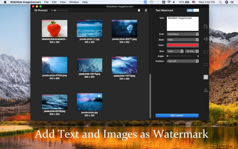 WidsMob ImageConvert should be the versatile photo converter to handle hundreds or thousands of images in batch. Whether you need to turn RAW into JPEG, resize, compress, rename, add border, add watermark in text or image, you can always turn photos into desired result within one click.