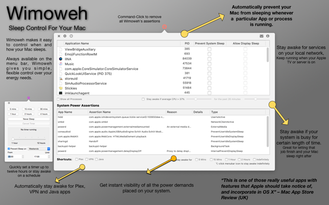 Wimoweh is a menu bar application that allows you to have better control over how your Mac sleeps
